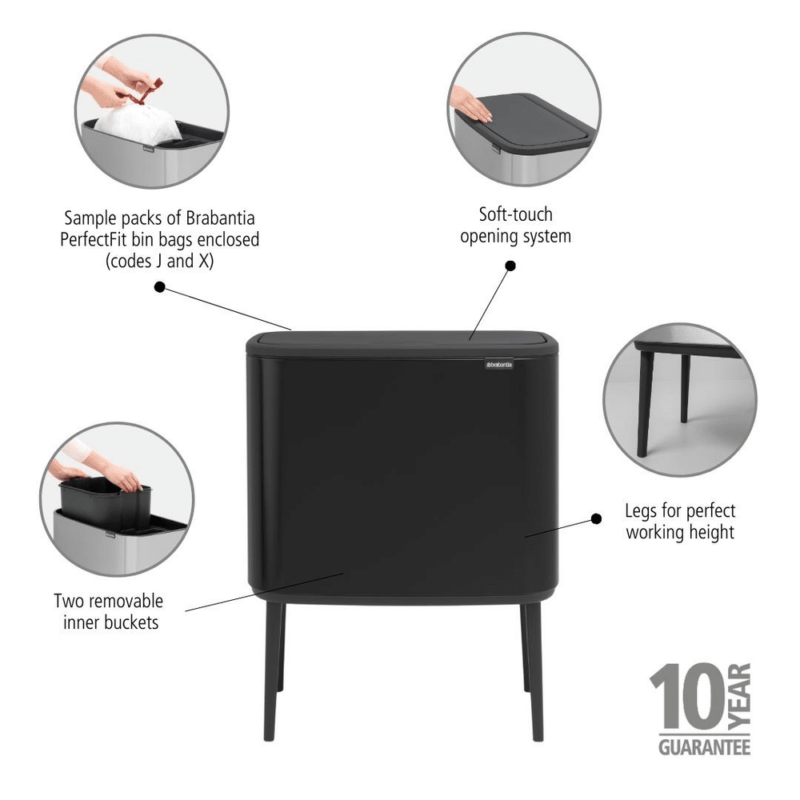 The Brabantia Bo Touch Bin, designed for hotels and hospitality. This stylish bin combines aesthetics with functionality, featuring two removable inner buckets for waste separation. With a space-saving design, adjustable non-skid legs, and soft-touch opening, it offers effortless operation and stability. Perfect for stylish waste management in any hospitality setting.