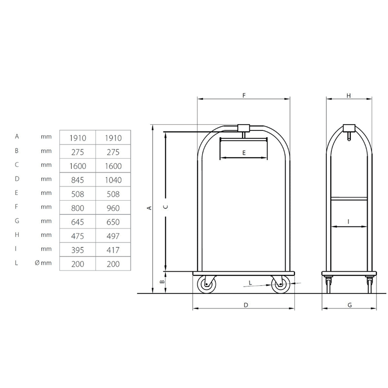 • Castors: 2 swivel and 2 fixed Ø200 mm ‘RG’