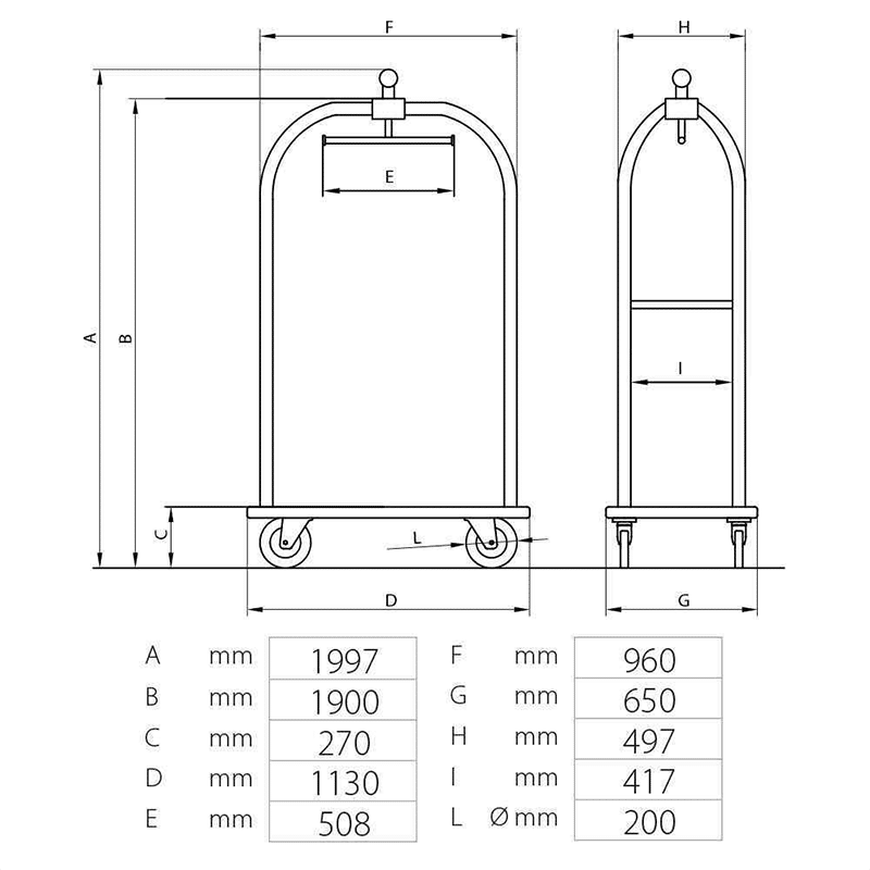 • Castors: 2 swivel and 2 fixed Ø200 mm ‘RG’