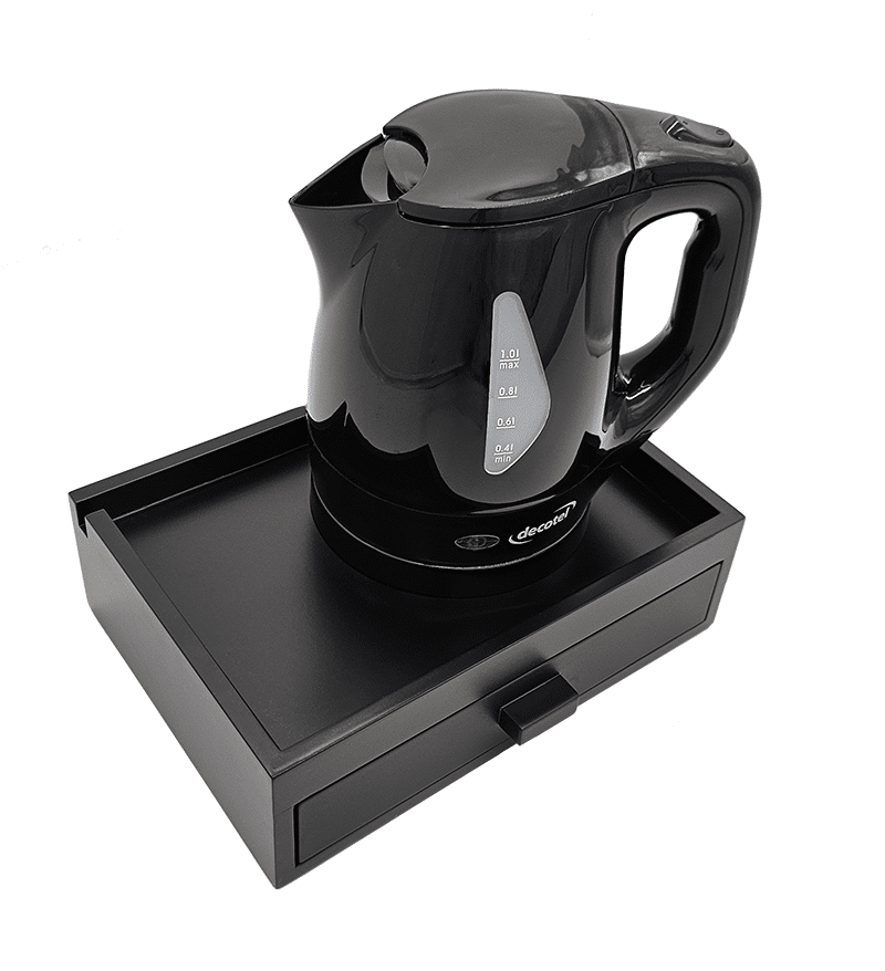 Decotel K3: A sleek black, compact cordless hotel kettle, designed for durability and ease. Packed with Decotel standards, it includes an illuminated indicator, 1-litre capacity, and safety features like auto cut-off and boil-dry protection with genuine Strix controllers for peace of mind.